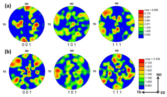 Figure 13. 001, 101, and 111 pole figures for MCSTE AA5083; (a) AA calculated from the EBSD data presented in Figure 2; (b) 1-Pass calculated from the EBSD data presented in (Figure 4c).