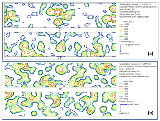 Figure 14. ODF sections at φ2 = 0° and φ2 = 45° for AA5083 MCSTE processed billets: (a) AA calculated from the EBSD data presented in Figure 3, (b) 1-pass calculated from the EBSD data presented in Figure 4c.