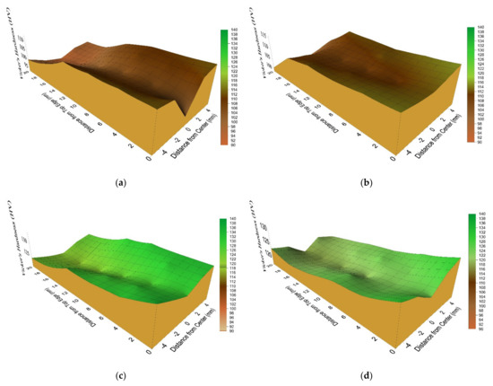 Figure 15 and Figure 16 depict the Vickers microhardness 3D-colored contours of the MCSTE AA5083 extrudates measured across LS and TS cross-sections, respectively. In addition, the Vicker’s hardness mean values recorded in the centeral and perpheral reigions of AA5083 samples are listed in Table 1. Figure 15 and Figure 16a–c show the microhardness evolution after MCSTE β 30° processing along the peripheral and central regions of the 1-pass, 2-passes, and 3-passes extrudates, respectively, and Figure 16d shows the evolution after 1-pass extrudate of MCSTE β 40° processing. The average microhardness of the AA billet is 80 Hv. From the displayed 3D-colored contours, it can be observed that a general increase in hardness occurs as a function of increasing number of passes. A gradual increase in hardness occurs along the peripheral and central regions of the 1-pass extrudate, as observed in Figure 15a, with the highest hardness values being recorded at the bottom segments along the periphery at 111.6 Hv compared to 97 Hv at the top segment. Similar observations were made after 2- and 3-passes MCSTE β 30° and 1-pass MCSTE β 40°, as shown in Figure 15b–d, respectively. This trend is illustrated by the strain distribution contours in [19], wherein higher hardness measurements coincide with higher strain values. Additionally, this observation is consistent with findings made by the authors in [30], where MCSTE processing of AA1100 led to an equivalent trend in hardness distribution. The authors explained that higher Hv values experienced at the bottom segments were due to the backpressure applied to the system which generated from the extension springs that connected to the pressing plunger, which imposed a resistance to the disk/billet assembly motion through the twist die [27]. It is worth to mentioning here that, the bottom part of the MCSTEed billets encounters a higher resistance to motion as a result of the backpressure springs which leads to increasing the hardness values of the bottom segment of the processed billets [27]. This resistance, although relatively small (5 MPa), induces an additional strain hardening effect that caused a short-range increase in the hardness at the bottom sections of the extrudates [30].