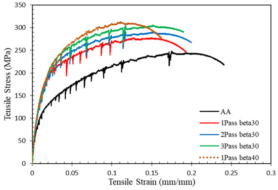 The stress-strain diagrams for AA5083 befor and after MCSTE processing are shown in Figure 17. In addition, Table 1 lists the yield strength (YS) variation alongside the ultimate tensile strength (UTS) and the elongation % of the various AA5083 alloys processed from 1 and up to 3-passes via MCSTE (β 30°) and of the alloy processed via 1-pass of MCSTE (β 40°) compared to the AA alloy plates. The displayed results reveal a trend of increased tensile strength with the increase of the number of MCSTE passes, compared to the AA condition. This can be attributed to the noticeable grain refinement with CDRX, which occurs with the increasing of the number of passes (as shown in Figure 3, Figure 6 and Figure 7 compared to Figure 2). As shown in Figure 17 and listed in Table 1, straining via 1-pass (β 30°) yields 111% and 9% increase in the YS and UTS, respectively, coupled with a 21% reduction in the ductility, compared to their AA counterpart.