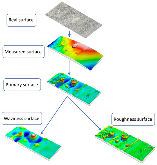 A profilometer Form Talysurf 50 and the Talymap software (6.0, Taylor Hobson Ltd., LE4 9JQ, Leicester, UK) were used to measure the roughness and to process the measuring data. An inductive gauge with a 2 µm radius was employed. A block diagram of the measurement procedure is shown in Figure 1. Measurements were carried out on surfaces of 5 mm × 2 mm along three different directions with respect to the rolling direction of the sheet, that is, 0°, 45°, and 90°. The measuring instrument provided an initial profile with some differences to the real surface because of the limitations of the contact profilometry, that is, the gauge radius. From the measured surface, the primary surface is obtained once its shape (the curvature in this case) is removed. Finally, by using a gaussian filter, the irregularities of the primary profile can be split up in the roughness and waviness profiles.