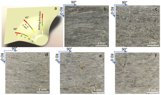 (a) Images corresponding to Part 5 (experiment 5) in the rolling direction at different depths; (b–f) correspond to Zones 1 to 5, respectively. The rolling direction, RD, corresponds to the vertical axis of the photographs.