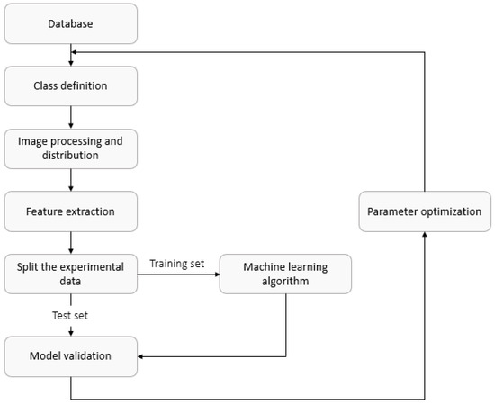 Initially, this work seeks to categorize images into several classes according to their surface roughness. Figure 3 depicts a block diagram where data processing and the training procedure are shown in detail. At this second stage, the classification learner from MATLAB software (2019b, MathWorks, Natick, MA, USA) was used.