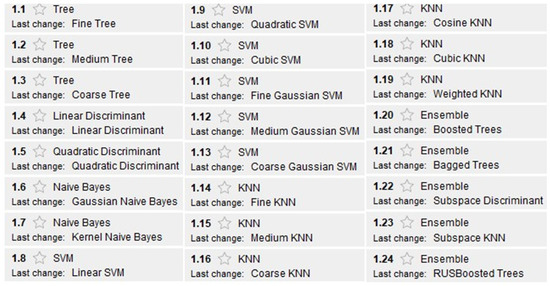 Under those conditions, all classifiers were trained. The supervised learning algorithms used to train the different models are shown in Figure 4.