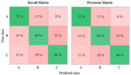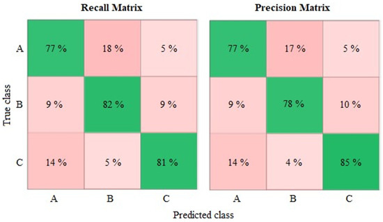 According to the recall matrix, the confusion is greater when distinguishing images belong to Classes B and C. Based on percentages, 23% of Class B images were incorrectly associated with Class C, whereas 19% of Class C samples were wrongly linked to Class B. Therefore, the predictive model displayed a better detection capability for roughness values in the first interval (Class A). Additionally, the precision matrix reflects a similar performance to that of the recall matrix, and so Class A presents the greatest reliability.