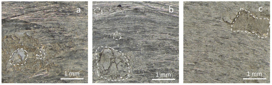 Only one major adhesive mechanism was confirmed with the temperature, but its influence on the part does not always occur in the same area (Figure 7a–d). Some evidence of this can be observed in Figure 8, where the re-adhesion process is clearly noticeable in different areas of the images (marked areas). Moreover, the peeling–adhesion phenomena can dominate the topography of a study area, as can be seen in Figure 8a.