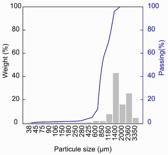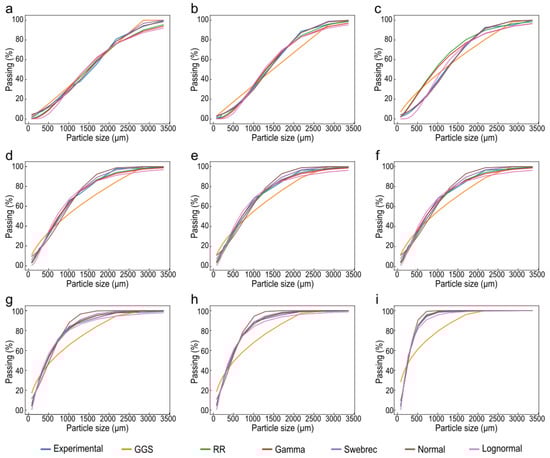 The six PSD models assessed are shown in Table 2. Gate–Gaudin–Schuhmann [27] and Rosin–Rammler [28] models have been the most popular and oldest functions used to describe PSD in granular materials. GGS was developed in the metalliferous mining industry and is described with a size parameter (largest particle size) and a distribution parameter [27]. The RR model was defined to evaluate the coal fragmentation processes but has been broadly used in many industries. The RR size parameter corresponds to 63.21% cumulative undersize, and the shape parameter defines the spread of sizes [28]. Even though these are handy models, the fitting accuracy depends on the material nature and size ranges.