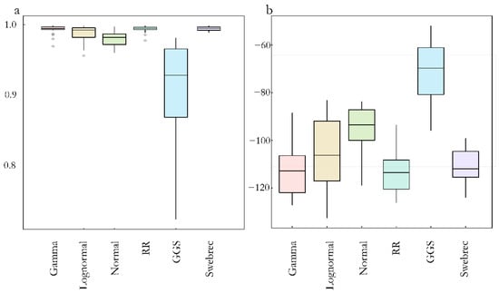 Akaike’s information criteria (AIC) Box plot is shown in Figure 2b. It was used to compare the model quality fit and identify the better fitting model, for an increment in goodness-of-fit requires lower AIC values. The AIC results were consistent with R2 and RMSE estimations, achieving minimum values in Gamma, Rosin–Rammler, and Swebrec distributions. However, the Swebrec model presented the least standard deviation. Lognormal and GGS models depicted poor fits with large mean and standard deviation values about AIC estimator.