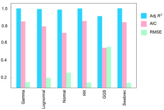 Figure 3 summarises the models’ criteria in a normalised bar chart. There are three bars (adjusted R2, AIC, and RMSE) for each distribution, representing the fitting results. GGS and Normal exhibit the larger RMSE values, while Lognormal function shows great AIC values. In addition, GGS presents the lowest adjusted R2 and larger AIC (the closer this criterion to one, the smaller its actual value). Gamma, RR and Swebrec distributions illustrate the better value points according to the three selected criteria, indicating the excellent correspondence between model prediction values and observed data. Though AIC penalised the model with additional parameters, the Swebrec model, which has three independent variables, is among the better-fitting functions.