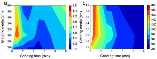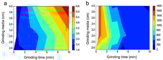 Regarding RR parameters, the shape parameter λ (Figure 6a) shows more stability in the central region, which means that the distribution is highly affected by conditions at lower and greater times. Meanwhile, at grinding times of 3–8 min, λ remains between 0.9–1.2, indicating a more wide size interval and a lower slope in the PSD. The scale parameter k (Figure 6b) presents a sensible change in the stability at 4 min grinding time. At grinding time less than 4 min, 3.00 and 4.00 cm ball sizes produce a limited size range with the feature that as ball size increases, the larger fragments do not break, resulting in larger values of k and λ, and indicating an inefficient ball-particle interaction. This situation could indicate that when using 3.00 and 4.00 cm grinding media, the dominant fragmentation mechanism is the chipping abrasion instead of impact breakage.