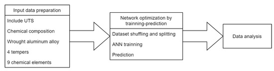 The main objective of this work is to develop a working methodology that allows optimizing the topology of a multilayer neural network in such a way that it is capable of making predictions about the of wrought aluminum alloys [34], maximizing the precision and accuracy of the estimation and minimizing the computational resources [20]. Although this paper only takes into account the , this same approach could be applied to other properties that have already been mentioned, such as the or the elongation at break (A).