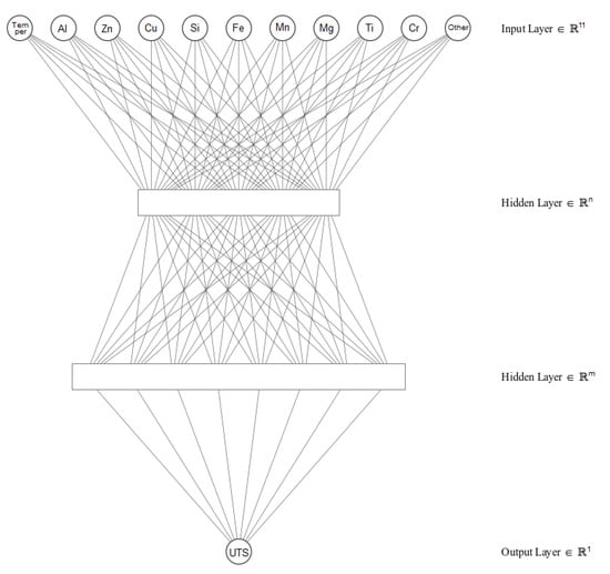 The neural network receives an input vector of 11 elements (chemical composition and temper) and returns a prediction about the value of the expected [3]. Therefore, the input layer is made up of 11 nodes, and the output layer only contains a single node. Additionally, the network topology contains two hidden layers whose number of nodes is to be optimized [19]. Figure 2 shows a schematic representation of the network in which the hidden layers are represented as squares.