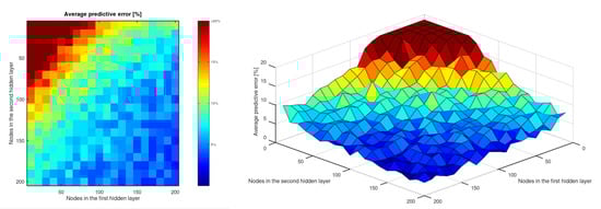 Figure 3 graphically shows the average predictive error (values above are trimmed to avoid scale-related issues). A region with a very low precision (error greater than ) can be seen for topologies with less than 150 perceptrons, while for more complex networks, the error remains lower (less than ). It is interesting to note that, as can be seen in the three-dimensional figure, the transition between both regions is quite abrupt, and a step (yellow zone) is formed. This transition zone (yellow) separates an almost flat area from a steep one.