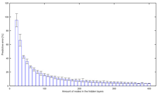It is interesting to highlight that, for neural networks with more than 300 nodes, the average predictive error remains, in all cases, approximately stable at around . It is a very interesting result since it establishes a boundary beyond which no significant improvement can be seen, although there is an increase in computational requirements.