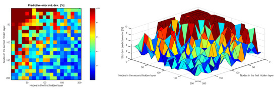 Figure 5 graphically shows the standard deviation of the predictive error (values above are trimmed to avoid scale-related issues). The distribution of values is much more irregular than in the case of the average error. However, three areas can be seen: for networks with less than 150 perceptrons, the standard deviation is high (mostly above ); for topologies with between 150 and 250 nodes, a very irregular transition zone is produced with scattered high values; and, for the more complex networks (more than 250 nodes), the values are mostly kept below .