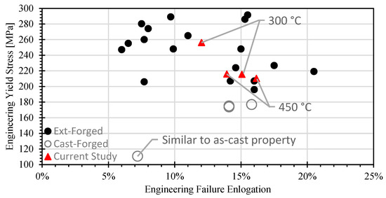 Relationship between ductility (failure elongation) and strength (yield stress) for forged AZ80 Magnesium (subdivided into various starting material conditions). The current study denotes properties extracted from various locations of the extruded then die-forged automotive suspension control arm forged at various temperatures (300 °C and 450 °C). For reference, extruded-forged data can be found in the following studies [5,6,7,8,9,10,11,12,13,16], cast-forged from [3,16].
