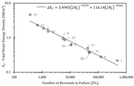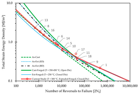 Similarly, Figure 5 illustrates the relationship between total strain energy density (total SED: summation of plastic and elastic energy per cycle, for the stabilized response), and Number of Reversals to Failure. The same AZ80 Mg material conditions are presented, cast [3], extruded [17], cast-forged [3] and extruded forged [17]. Once again, the individual data for the current study are shown to illustrate the amount of variability relative to the fitted E-N property curve generated using the well-known Jahed-Varvani approach [29]. Similar observations can be drawn to those from the ε-N properties, with the extruded-forged material exhibiting a longer life for a given strain energy density in the HCF regime, with a similar transition threshold between plastic and elastic behaviour being the salient deformation mechanisms. Of particular interest, however, is the apparent similarity in damage tolerance of the as-extruded material in both material directions (ED/RD) in the LCF regime. More specifically, the damage tolerance of the as-extruded material is insensitive to the material direction and can be considered to be isotropic at high levels of plastic deformation (ET > 2.0 MJ/m3), at least on the basis of using strain energy density as a fatigue damage parameter. This observation delves deeper into the structure-property relationship of AZ80 Mg, as within the same material condition, we can observe the effects of texture on the fatigue properties, and in what domain of fatigue (LCF/HCF) they are most significant. This variability in the individual data for the current study is once again linked to variation in thermomechanical histories for the location for which each sample was extracted from the forging, and the associated variations in the damage tolerance of the resulting material. The applications of utilizing total strain energy density as a damage parameter for forged AZ80 Mg will be discussed in Section 3.3.