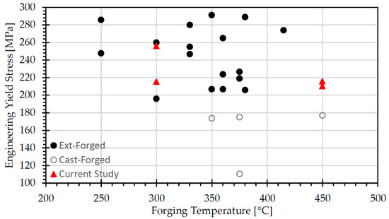 Relationship between primary thermal process parameter (forging temperature) and resulting yield strength of AZ80 Mg after forging (subdivided into various starting material conditions). The current study denotes properties extracted from various locations of the extruded then die-forged automotive suspension control arm forged at various temperatures (300 °C and 450 °C). For reference, extruded- forged data can found in the following studies [5,6,7,8,9,10,11,12,13,16], cast-forged from [3,16].