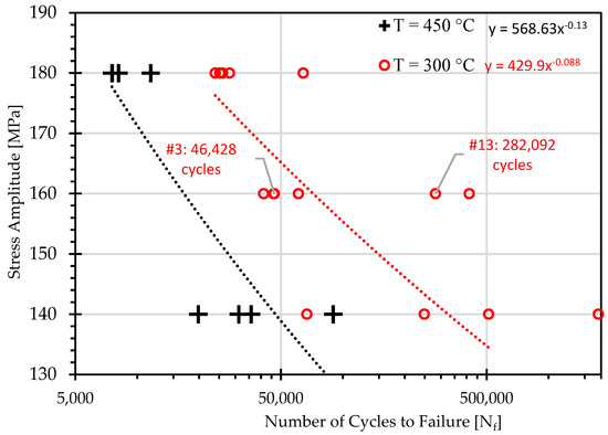 The stress-controlled fatigue response of the closed-die forged AZ80 Mg automotive suspension component is illustrated in Figure 7 for the two target forging temperatures that were investigated in this current study. It can be easily observed that for virtually all of the tests performed, for a given stress amplitude, the lower forging temperature (300 °C) provides a longer life in comparison with those components which were forged at 450 °C. In general, the lower forging temperature of 300 °C shows an improvement in life of ~3× longer at 180 MPa and ~7× longer at 140 MPa, with the more dramatic improvement in the HCF as the superior strength contributes to lower fatigue damage and less cyclic plasticity. However, the level of variation in the life for a given stress amplitude increases at the lower forging temperature, indicative of a less uniform fatigue properties throughout the forged component, which can be attributed to a similar effect observed by Gryguć et al. [24] where AZ80 forgings done at lower temperatures exhibit more bimodal grain structures, with spatially varying precipitate content throughout the forging, and higher temperatures lead to increased microstructural homogeneity, lack of precipitate content and overall grain growth. This increase in variability in the fatigue performance of die-forged AZ80 Mg at lower temperatures is obvious here in the current study where the forgings were air-cooled with no additional heat treatment. However, other researchers have investigated controlling the precipitation of second phase particles of AZ80 Mg by immediately quenching the component following forging, then followed by a subsequent aging (T5) treatment, with promising results [30]. In general, a significant component of the variability observed in the properties of the as-forged components stems from the air-cooling following forging, and the resulting variability in local cooling rates throughout the complex geometry of the forged component itself. For this current study, the as-fabricated condition (-F) was intentionally selected as it provides insight into the nature of the resulting microstructure from the forging process itself, providing a better basis for comparison of the thermal process effects. Furthermore, to maintain consistency with the majority of the studies on forged AZ80 in the literature that have been presented here for comparative purposes, we have also characterized the properties in the as-fabricated conditions. The variability resulting from air-cooling, and the effect of artificial aging on both the mechanical properties and fatigue damage mechanisms of closed-die forged AZ80 is an effect that complicates the forging process design and is the focus of current and ongoing work. Furthermore, the pre-heating of the billet prior to step 2,3 and 4 of forging (bending, flattening and die-forging), introduces some unintentional yet complex thermal history resulting in a “pseudo”-aging or solutionizing treatments to the billet prior to forging depending on the target temperature, as the billet is held at various temperatures for a few hours at each step. There inevitably is some impact on the precipitates as a result of this complex thermal history prior to forging, which is further complicated by the fact that the starting microstructure prior to the die forging is then significantly mechanically deformed which can break-up and refine the precipitates, compounding with the effects of DRX. Despite this, the thermal history is only part of the thermomechanical processing history, and the effects of the process variables which are mechanical in nature will be subsequently discussed.