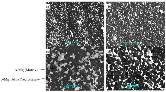 SEM images using a JEOL JSM-6460 (JEOL, Longueuil, QC, Canada) of extruded AZ80 Mg which was then closed-die forged at 300 °C and air-cooled, in two different locations of the forging (a,c) location #3, and (b,d) location #13. Please refer to Figure 2 for referencing each location number to the corresponding location within the forged component.