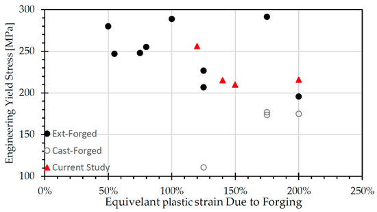 Relationship between primary mechanical process parameter (equivalent local strain due to forging) and resulting yield strength of AZ80 Mg after forging (subdivided into various starting material conditions). The current study denotes properties extracted from various locations of the extruded then die-forged automotive suspension control arm forged at various temperatures (300 °C and 450 °C). For reference, extruded-forged data can be found in the following studies [5,6,7,8,9,10,11,12,13,16], and cast-forged from [3,16].