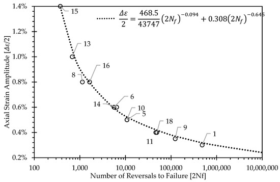 The influence of the properties on the performance of the material is an emerging topic in the field of forged Mg alloys as characterizing the mechanical properties of forged Mg is now somewhat well understood [1]. Furthermore, optimization of the forging process parameters with an aim to improve the in-service performance of forged Mg components is an area that shows promise for future work. The influence of the materials structure and the forging process on the structural properties (both monotonic and fatigue) that was previously discussed highlights the impact of the highly complex thermomechanical nature of closed die forging AZ80 Mg to produce intricate 3-dimensional components such as the automotive suspension component presented here in this current study. Since the in-service requirements of the automotive suspension component are highly reliant on its fatigue performance, optimizing the forging process parameters for fatigue critical components is an important contribution of this work. Figure 10 illustrates a typical strain-life (ε-N) curve for the optimum condition (of those which were investigated), which is 300 °C for an extruded then closed die forging of an AZ80 Mg automotive suspension component. The Coffin–Manson parameters associated with the response of the forged material highlight the representative (or average property) across the entire component. The spatial variation in properties that was previously discussed linked with the variations in thermomechanical history throughout the component are the main contributors towards the data’s deviation from the modelled Coffin–Manson type behaviour. Furthermore, the anisotropy associated with the spatial variations in texture throughout the component also contributes to these variations in properties as the fatigue specimen orientation within the forged component also varies due to pragmatic geometrical constraints. Each location in the control arm is denoted in Figure 10 as to develop a link between the property and the performance observed service. The nature of using strain as a basis for comparison of fatigue performance intrinsically penalizes higher strength material as was observed in the extruded-forged material from Figure 4 as the cyclic stresses for a given fully reversed strain cycle will be higher than lower strength locations. This point has been discussed extensively in earlier studies [3,17]. Despite other rudimentary works on characterizing the fatigue of die-forged Mg full-scale components, to the authors’ knowledge, this current work is the first research study conducted which presents strain-controlled fatigue properties, for a forged Mg component of full-scale industrial relevance (i.e., not research/lab type specimens).