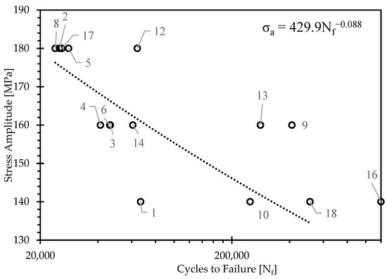 S-N curve for the current component level study (AZ80 Mg, extruded then closed die-forged at 300 °C). Various locations throughout the forging are denoted for each data point corresponding to the nomenclature in Figure 2. Denoted by the dashed line is “design curve” which is presented for reference with its equation acting as a representative fit to the data. Please refer to Figure 2 for referencing each location number to the corresponding location within the forged component.