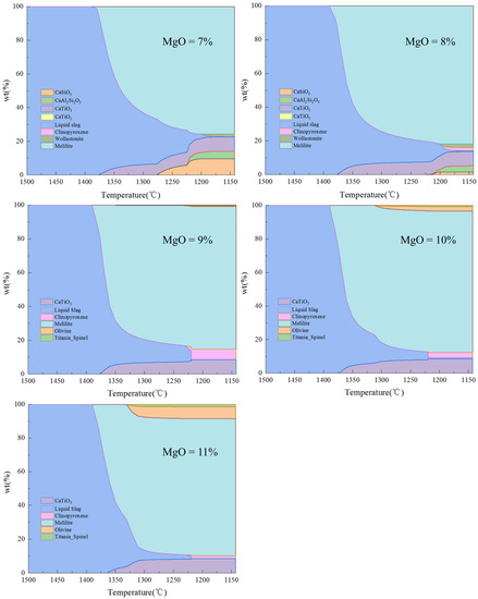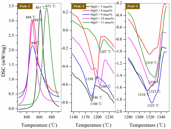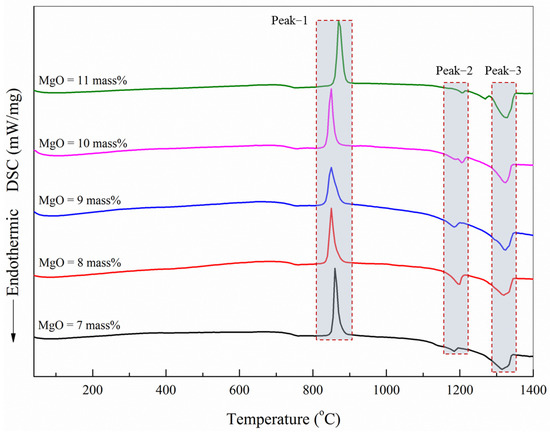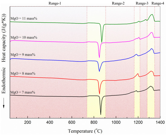 3.1. DSC Curves of BF Slag with Different Contents of MgO