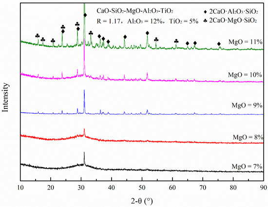 3.3. Analysis on Phase and Micro Morphology of BF Slag with Different Contents of MgO