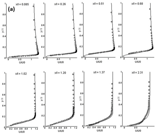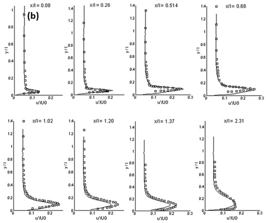 (a) Mean streamwise velocity, (b) rms streamwise velocity at different streamwise stations (ETL-case) (LES: solid lines, experimental data: symbols, x/l: normalized streamwise, y/l: wall-normal direction, U/U0: normalized mean streamwise velocity, u’/U0: normalized rms streamwise velocity) [126].