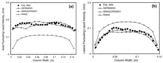 Comparison of model predictions with experimental data for (a) axial and (b) lateral liquid velocity fluctuations at a height of 0.25 m in a square cross-sectioned bubble column with a superficial gas velocity of 4.9 × 10−3 m/s [129].