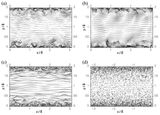 Velocity vectors of the LES inlet condition for hybrid simulation of channel flow: (a) precursor LES, (b) SEM, (c) Batten’s method, (d) random method (y/δ: normalized y distance, z/δ: normalized z distance, δ: initial boundary layer thickness) [143].