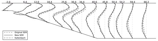 All the aforementioned methods belong to the category of the Eddy Viscosity Model (EVM). Some other advanced EVMs were developed [41,42,43,44,45]. In order to account for the strong anisotropy in the near-wall region, Durbin [41] adopted a new turbulent viscosity term defined in Equation (12), which is considered to be more appropriate than that defined in Equation (6) in a near-wall region. A separate transport equation for a wall-normal turbulent stress was proposed and solved with the aid of the elliptic relaxation concept. This model is termed the -f model, where f represents the elliptic relaxation function. Subsequently, several modified versions were proposed with respect to the velocity scale [44], the characteristic length [42], the function f [45], and the variable [43]. This model category performs well for pressure-induced separating flow, buoyancy impairing turbulent flow, and backstep flow [44,45,46].