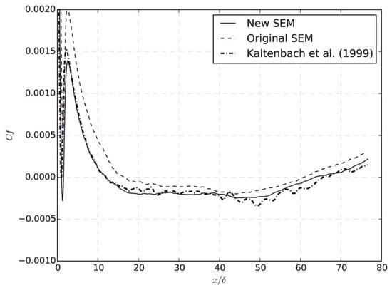 The synthetic method as an alternative to the precursor simulation is expected to construct the inflow conditions for practical flows. The simplest way is to impose a white-noise random component on the inlet velocity. The magnitude of this random component is determined by the turbulent intensity. Since the turbulence-like component is rapidly dissipated due to the lack of spatial and temporal correlation, this white-noise method is inappropriate to generate the inflow data [135]. In order to impose realistic inflow data on the inlet boundary, other advanced synthetic methods have been developed. These advanced methods consist of the Fourier technique [136,137], principal orthogonal decomposition (POD) method [138,139], digital filtering technique [140,141], and synthetic eddy method (SEM) [142,143,144]. Several comparative studies have been performed on different synthetic methods [143,144,145,146]. Jarrin et al. [143] used the SEM in the hybrid RANS/LES simulations for turbulent flows from simple channel and square duct flows to the flow over an airfoil trailing edge. Compared to other synthetic methods (i.e., Batten’s method (Fourier method) [136] and random method), the SEM can substantially reduce the inlet section, leading to a large decrease in the CPU time. Figure 3 shows a better performance of the SEM in the inlet velocity vector compared to that of the others. The SEM realistically reproduced the magnitude and length scale of the fluctuations. The fluctuations in the Batten’s model decorrelated in space in the near-wall region due to the decomposition in Fourier’s mode. Recently, Skillen et al. [144] improved the SEM of Jarrin et al. (Original SEM) [142] with respect to the normalization algorithm and the eddy placement. The former leads to an improvement over the original SEM model. The latter saves a cost of around 1–2 orders of magnitude. Figure 4 and Figure 5 show the turbulent shear stresses and skin-friction coefficients from the original SEM [142], the improved SEM of Skillen et al. [144], and the precursor LES of Kaltenbach et al. [147]. In comparison with the original SEM, the improved SEM shows a better agreement with the precursor LES results both for the turbulent shear stress and the skin-friction coefficient. Although there is a rapid development of synthetic methods, the available synthetic methods are limited to construct the inflow condition with all required turbulence characteristics mentioned above. Further development is needed. It is unnecessary to claim which method is the best; however, the most appropriate method can be selected by considering the accuracy and the computational cost.