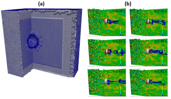 (a) Mesh used in the BIT study, (b) turbulent eddy generated on the highly deformable bubble surface (Q-criterion with a value of 100) [155].