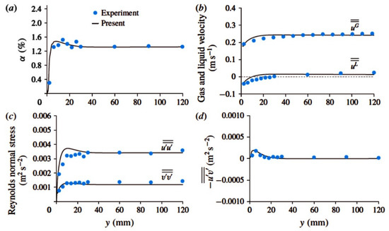 Comparison between the model of Ma et al. [231] and the experimental data of Akbar et al. [233]: (a) gas void fraction, (b) streamwise velocities of the liquid and gas phases, (c) Reynolds normal stresses of the liquid phase, (d) Reynolds shear stress of the liquid phase.