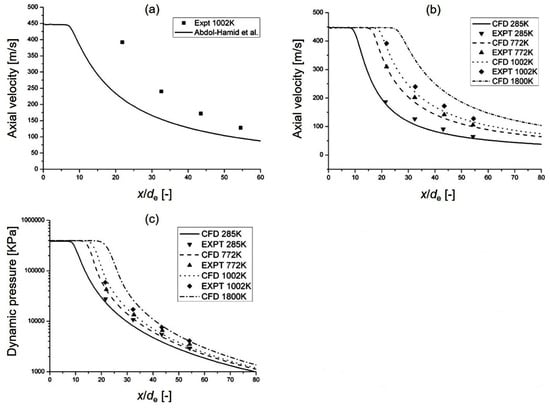 (a) and (b) Axial velocity distribution, (c) dynamic pressure distribution along the central axis of the jet (x: distance along the central axis, de: nozzle diameter) [243].