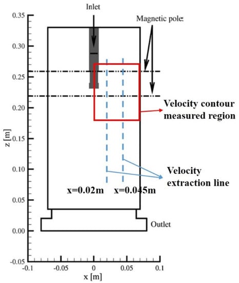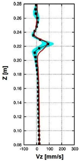 The time-averaged vertical velocity along a vertical line in the midplane at x = 0.045 m (B0 = 310 mT with electrically conducting mold) [264] (The data extraction line in Figure 10).