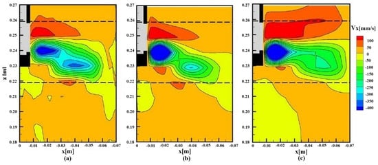 The time-averaged horizontal velocity in the midplane parallel to the mold wide face with electrically conducting mold walls, B0 = 310 mT (within the dotted lines): (a) experimental results, (b) numerical results from the SST k-ω model + Joule dissipation, (c) numerical results from the conventional SST k-ω model [264] (The measured region in Figure 10).