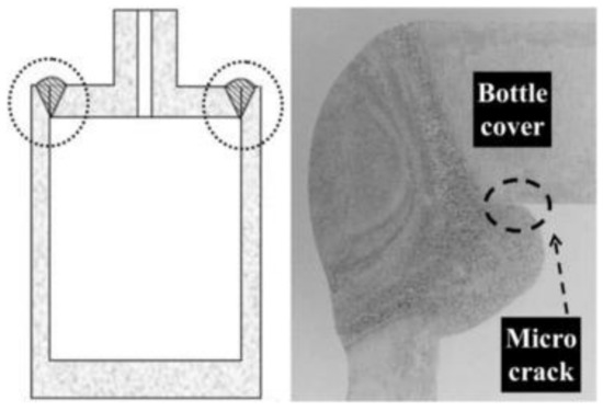 It is widely accepted that hydrogen embrittlement (HE) has become a serious problem since high-strength steel became widely used [5,7,13,14]. With the widespread application of aluminum alloys, it’s found that aluminum and its alloys also have a higher hydrogen content [15,16,17]. However, due to the wide application of aluminum alloys, when hydrogen embrittlement causes the failure of aluminum alloys, catastrophic accidents can occur. In order to alleviate these conditions, hydrogen embrittlement must be paid enough attention [18]. It affects the service safety of aluminum alloys in the automotive, hydrogen energy, aerospace, petrochemicals, and other industrial fields [19]. Through the sorting and reading of the references, we concluded that the main cause of aluminum alloy failure is fractures, and HE will lead to the fracture of aluminum alloys. Finding effective protection methods to prevent hydrogen embrittlement is an urgent matter [20]. Aluminum alloys with low mass and reasonable mechanical properties are considered as promising alloys for structural materials in aerospace systems and vehicle products [21,22]. The research direction of fuel cells and hydrogen energy safety includes three themes: hydrogen energy supply, fuel storage tank design and hydrogen leakage [23]. According to the related study, the dotted circle as shown in the Figure 2 is the key part of the hydrogen storage bottle when being produced. There may be micro cracks between the bottle cap and the weld [24], which will make hydrogen embrittlement more likely to occur [25].