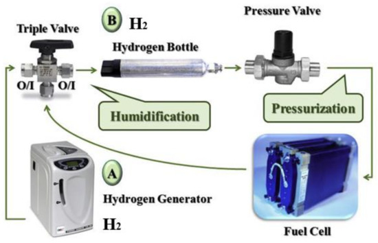 Figure 3. Working principle of a kind of hydrogen storage bottle: (A) H2 → hydrogen bottle→fuel cell, (B) Fuel cell anode: Pt-H2 → 2H+ [22].