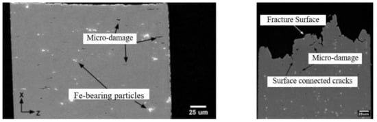 Based on this, Verners et al. [34] studied aluminum with a face-centered cubic structure. They found that the hydrogen diffusivity has a strong dependence on the microstructure. The concentration of hydrogen can be increased by the existence of dislocations, which in turn leads to HE. Apart from that, according to Lynch’s research results, it also shown that the HE mechanism of face-centered cubic structured materials was likely to be HELP [37]. Gupta et al. [31] used synchrotron microtomography to observe a 7075 aluminum alloy sample after hydrogen charging. This showed that the deformation caused the redistribution of hydrogen, forming an expansion and accumulation zone near the intergranular crack. The agglomerated damaged area was proved to be a mechanical result, which caused intergranular damage due to its easy trapping of hydrogen. However, it did not show whether the agglomeration zone was formed before the intergranular cracks developed. The causal relationship between the agglomeration zone and the crack development could not be clarified. In all images, the alloy matrix is shown in gray. Many dark and bright objects of different shapes are embedded in these gray matrices. The bright objects in the slices are intermetallic particles (including Fe, Cu, and Al) commonly found in AA7075, while the dark objects are different types of microdamage. These dark objects were considered microdamage areas because they have obvious halos at the edges, as shown in Figure 4.