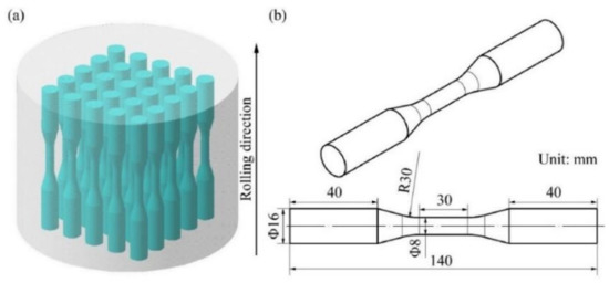Figure 8. Location (a) and dimensions (b) of the aluminum alloy tensile specimen [48].