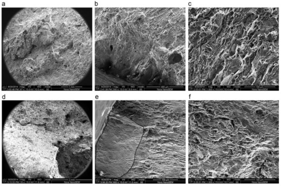 Figure 9. Fractographs of samples tested in 0.01 M NaOH with hydrogenation at a strain rate of 10−4 s−1: Ic = 1 mA/cm2 for (ac) and Ic = 5 mA/cm2 for (df), which is shotted by SEM [45].