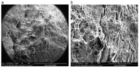 Figure 10. The fracture surface of a sample tested in laboratory air: (a) Low magnification fractgraph; (b) High magnification fractgraph shows ductile failures with a profusion of dimples and the precipitates/inclusions are observed inside the dimples [45].