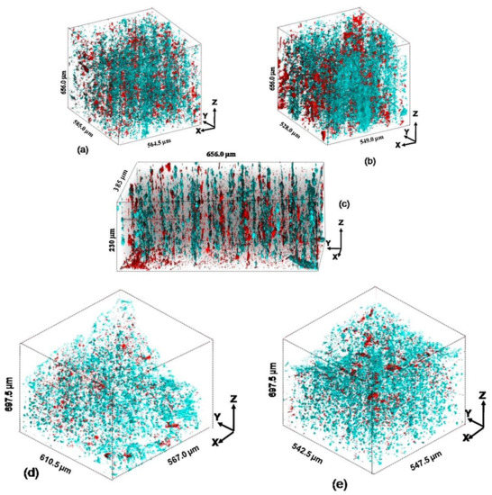 Figure 11. 3D visualization of the volume scanned using microtomography showing the internal segmented volume of the various datasets containing particles (aqua), pores/voids (red) and cracks (yellow). The datasets are (a) (Uncharged) (b) (Charged) (c) (Desorped) (d) (Deformed extracted from centre region) (e) (Deformed and extracted from surface region). The Z-axis represents the direction of extrusion [31].
