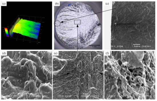 SEM and 3D laser measurements are used to observe microscopic images of fracture of aluminum alloy [60]. The work is intended to study HE of aluminum alloy under high stress and low stress amplitude (the fewer the number of cycles), as shown in Figure 12. It is believed that the fracture of a material can be divided into three stages: initial crack formation, crack propagation, and finally material fracture. Figure 12c only shows one crack initiation site on each sample, and Figure 12d shows fatigue streaks that appear in the crack propagation stage of fatigue failure. Moreover, it can be seen that the fatigue fringes produced under high stress amplitude are wider than those produced under low stress amplitude. Finally, as shown in (f), the final fracture area of the sample shows a pitted surface.