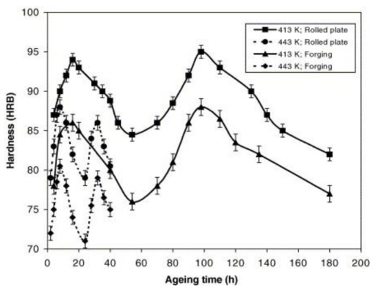 Figure 15. Two peaks of 7175 aluminum alloy aging at 413–443 K [43].