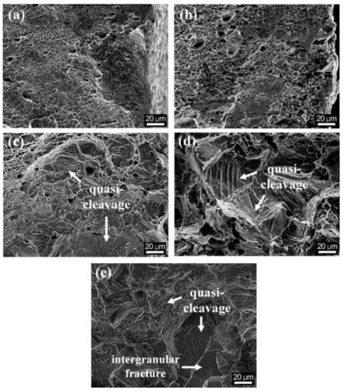 Figure 17. Fractographs taken at the edge parts of fractured hydrogen-charged tensile specimens with grain sizes of (a) 6.4 μm, (b) 16.5 μm, (c) 30.4 μm, (d) 53.1 μm and (e) 79.8 μm [78].