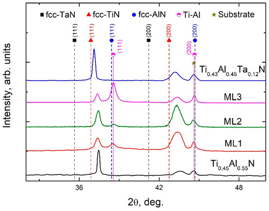 EDS analysis revealed that the Ti1−xAlxN monolithic coating as well as the Ti1−xAlxN layers in the multilayers were characterized by a Ti/Al ratio of 45/55 at %. The same Ti/Al ratio was also found in the Ti-Al layers. The Ta-alloyed coating was represented as Ti0.43Al0.45Ta0.12N. The X-ray diffraction patterns of the coatings are shown in Figure 1. An analysis of the XRD patterns showed that the Ti0.45Al0.55N and Ti0.43Al0.45Ta0.12N monolithic coatings are Ti1−x−yAlx(Tay)N solid solutions with single-phase cubic B1 (NaCl-type) structure. The XRD patterns of the Ti0.45Al0.55N/Ti0.45Al0.55 multilayer coatings also exhibit the diffraction peaks of the same phase. In addition, the peaks of the TiAl γ-phase with tetragonal L10 structure are seen in the XRD patterns of the multilayers. The strongest TiAl peak appears on the XRD pattern of the coating with the thickest metal layers (ML3). It is worth noting that the Ti1−x−yAlx(Tay)N diffraction peaks at the XRD pattern of the Ti0.43Al0.45Ta0.12N coating are shifted towards lower diffraction angles compared to other samples. This can be attributed to the higher residual stress in this coating as well as to the presence of the fcc-TaN phase, which lattice constant (0.434 nm) is larger than that of TiN. The XRD analysis also indicates the texture changes in the multilayer coatings compared with the monolithic ones. Crystallites in both monolithic coatings preferentially grow along (111) direction, while the multilayers exhibit (200) Ti1−xAlxN texture.